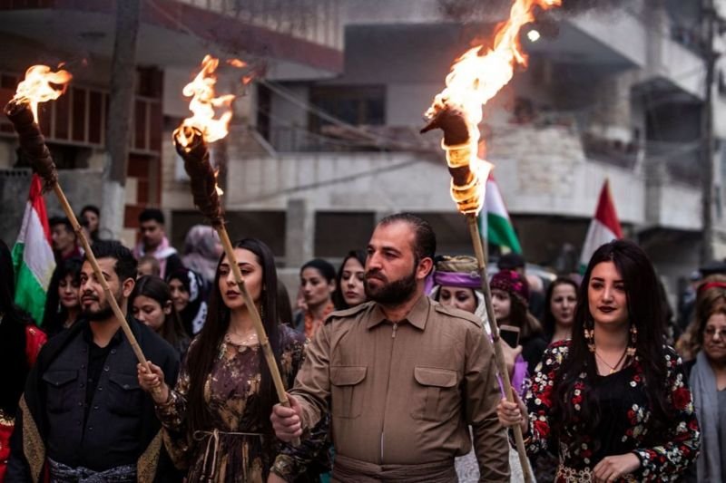 يحتفل الكُرد في سوريا بعيد نوروز في 21 آذار/مارس من كل عام، وهو اليوم الذي يمثل الاعتدال الربيعي، حيث يحتشد فيه المئات في مناطق متعددة في الشمال السوري على أنغام أغاني الفلكلور الكردي والدبكات الشعبية، مرتدين الأزياء التقليدية.
